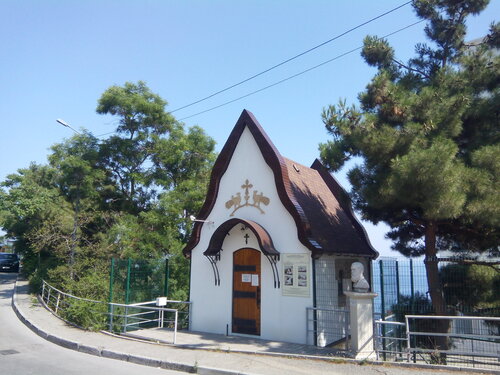 Чуть дальше возвышается небольшое здание, в его облике угадывается нечто готическое. Вывеска сообщает, что это часовня в честь князя Владимира. Рядом установлен белокаменный бюст, но уже не князю, а архитектору Максимову. Таким неординарным образом кинокомпания «Союз Маринс Групп» увековечила память о трагически погибшем владельце фирмы Александре Куликове.